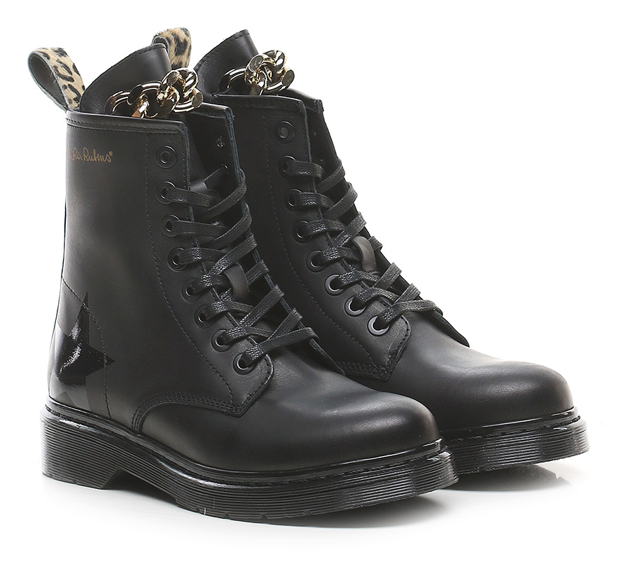 Polacco in pelle con accessorio catena gold frontale. Zip laterale. Suola in gomma. Altezza tacco 35mm, platform 20mm con battuta 15mm.
