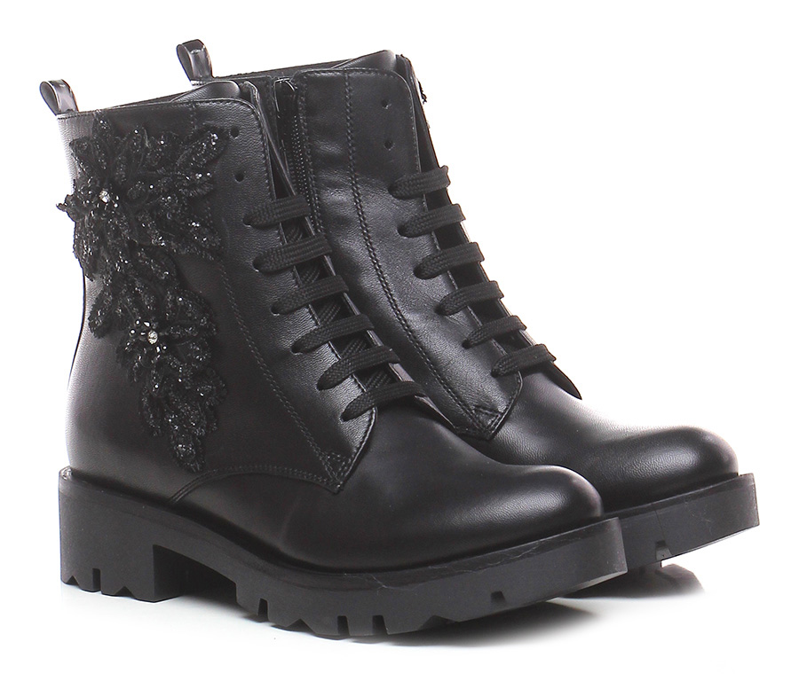 Polacco in pelle con zip lato interno e applicazione lato esterno in glitter e strass, suola carrarmato in gomma. Tacco 40, platform 20 con battuta 20.