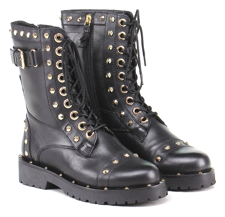 Polacco in pelle con zip su lato interno, cinturino su retro e borchie su tomaia. Suola in gomma, tacco 40, platform 20 con battuta 20. Borchie su profilo suola.