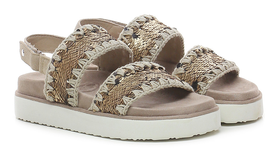 Sandalo basso in tessuto e paillettes reverse, suola in gomma. Tacco 45, platform 40 con battuta 5. Morbido plantare fussbett e cinturino sul retro con chiusura a strappo.