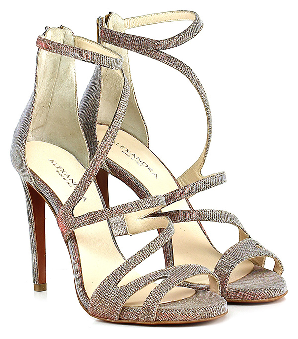 Sandalo alto in tessuto lurex con zip su retro e suola in cuoio. Tacco 110, platform 15 con battuta 95.