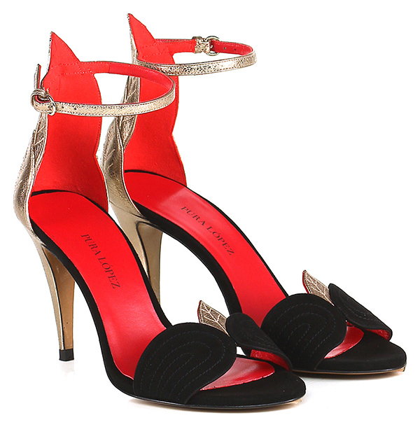Sandalo alto in camoscio e pelle laminata effetto crack con cinturino alla caviglia e suola in cuoio. Tacco 90.