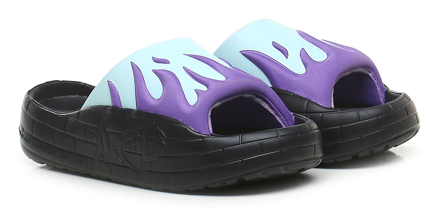 Sandalo in gomma e tessuto. Suola in gomma: altezza tacco 35mm, platform 25mm con battuta di 10mm.