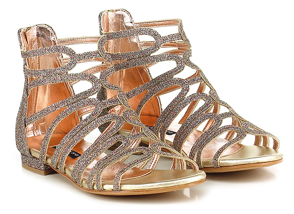 Sandalo basso in glitter con zip su retro e suola in cuoio. Tacco 15.
