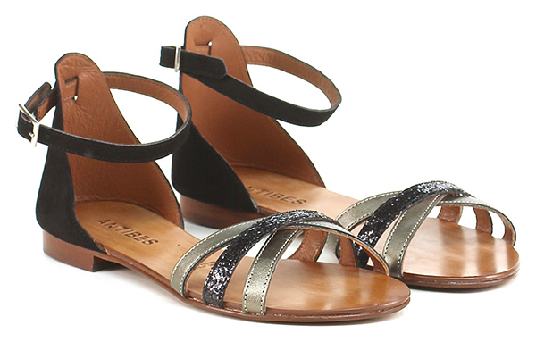 Sandalo basso in glitter, pelle e pelle laminata con cinturino alla caviglia e suola in gomma. Tacco 15.