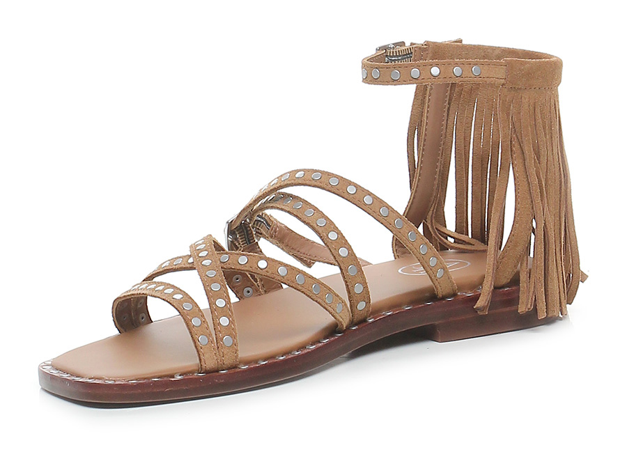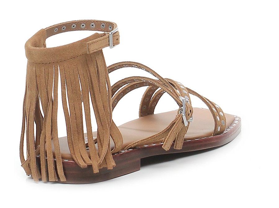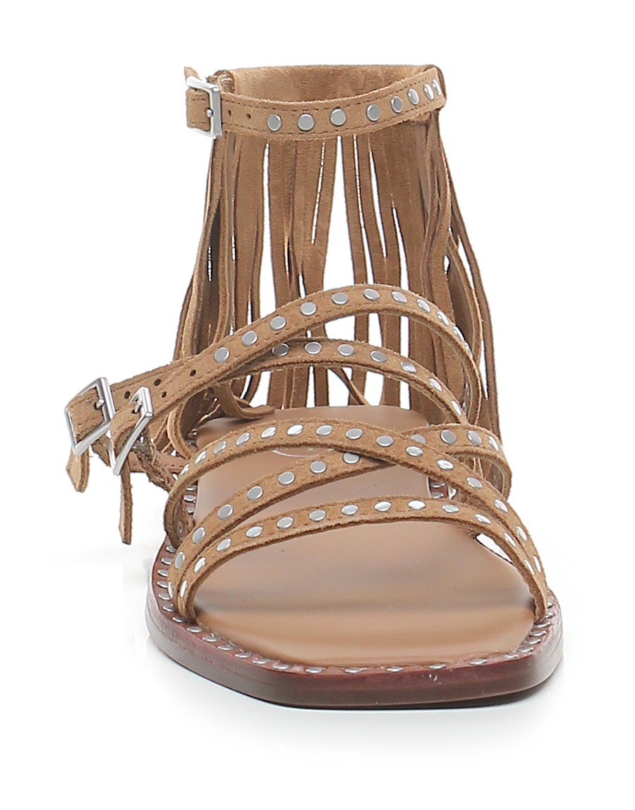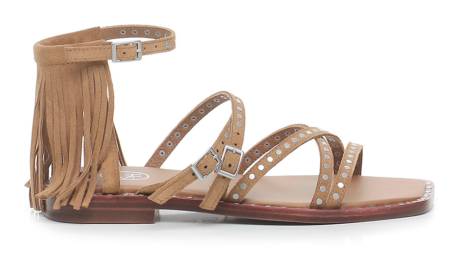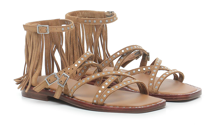 Sandalo basso in camoscio a listini con doppio cinturino, suola in cuoio. Tacco 20. Frange sul retro e applicazioni di borchie bordo suola e tomaia.