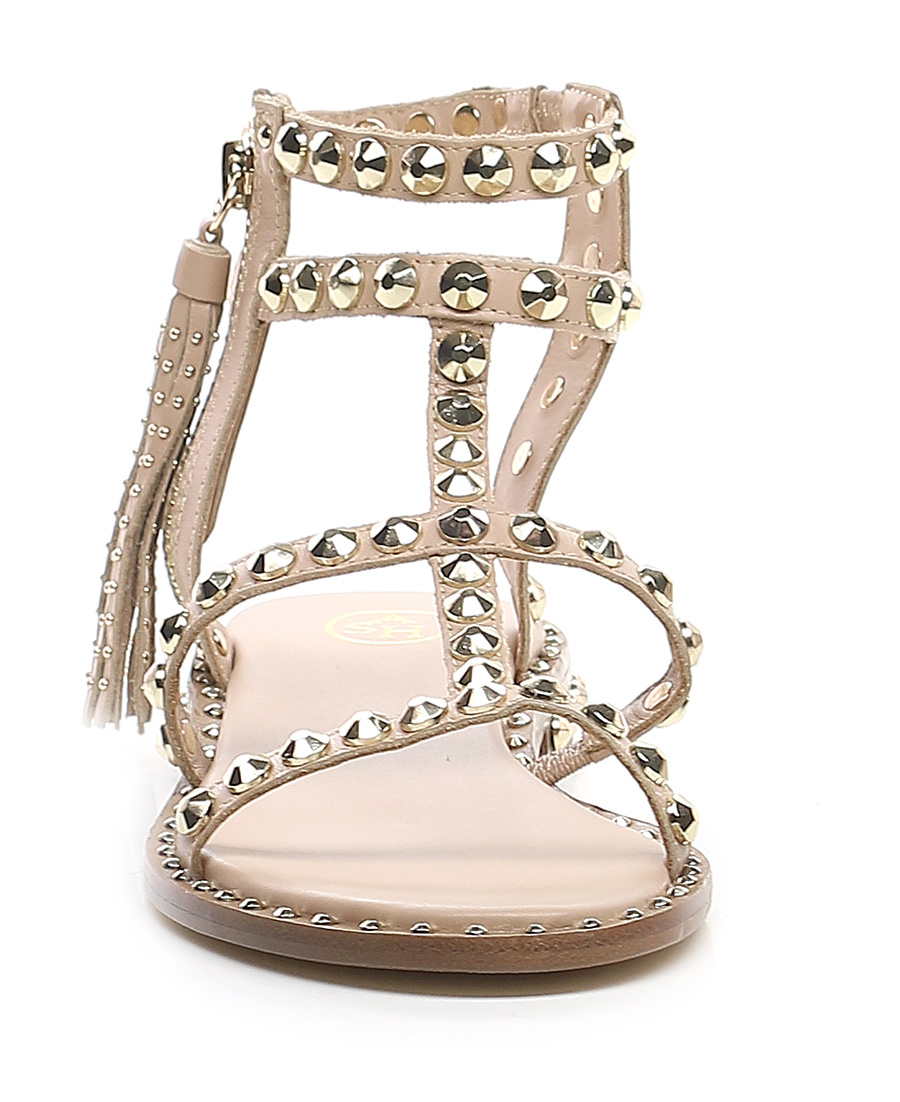 Sandalo in pelle con doppio cinturino alla caviglia e zip laterale con nappina. Borchie gold su tomaia, tacco e profilo suola. Suola in cuoio. Altezza tacco 20mm.