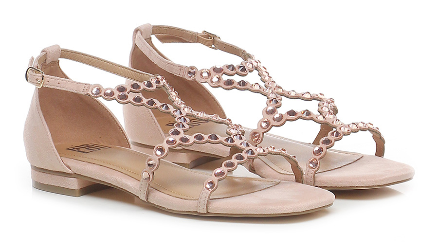Sandalo basso Bibi Lou in tessuto scamosciato con cinturino alla caviglia e strass su tomaia, suola in gomma. Tacco 15. Plantare imbottito.