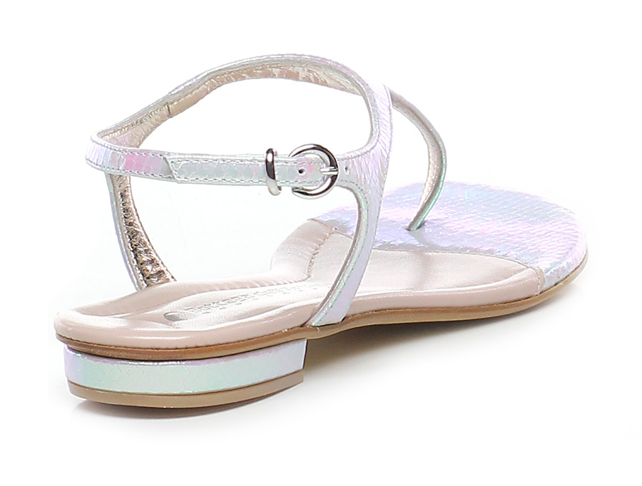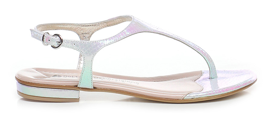 Sandalo a infradito in pelle laminata stampa pitone effetto madreperla, suola in cuoio. Tacco 15, tacco rivestito in pelle stampa pitone.