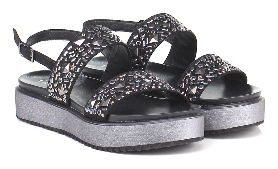 Sandalo basso in tessuto con cinturino su retro e multi borchie su tomaia. Suola in gomma, tacco 40, plantare fussbett.
