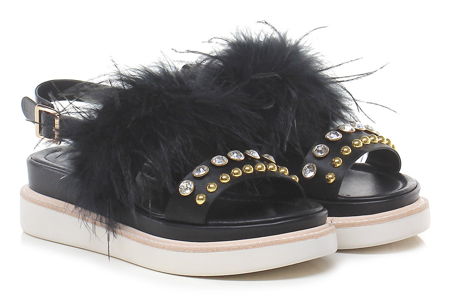 Sandalo basso in tessuto e pelle con cinturino su retro e borchie, pietre e piume su tomaia. Suola in gomma, tacco 55, platform 35 con battuta 20.
