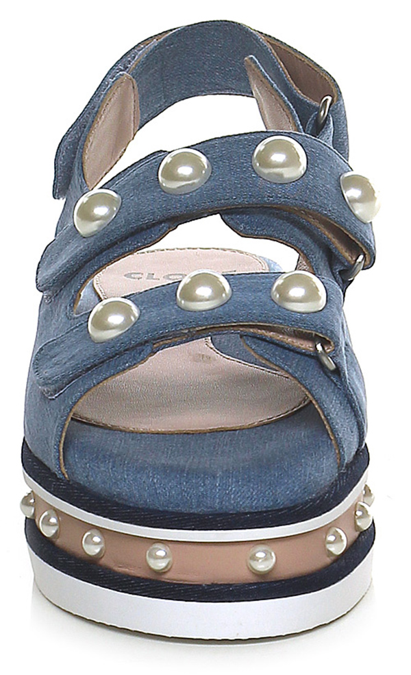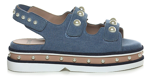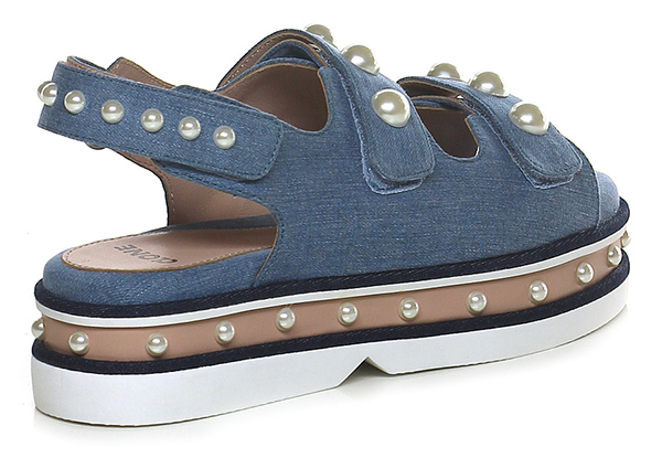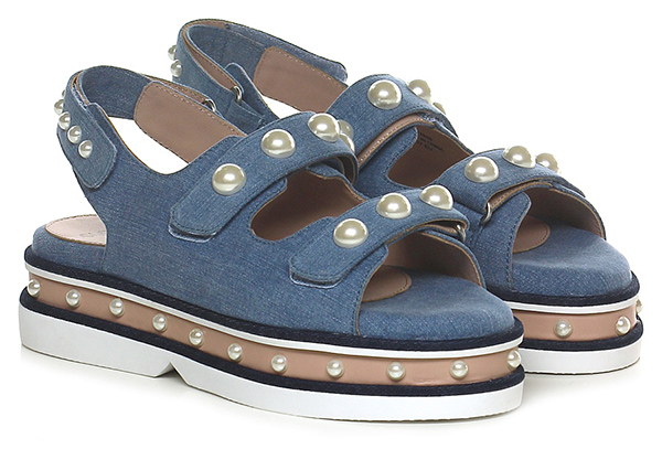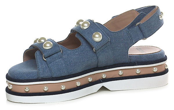 Sandalo basso in tessuto e pelle con cinturino su retro a strap con perle. Doppio cinturino frontale con perle, suola in gomma, tacco 55, platform 45 con battuta 10.