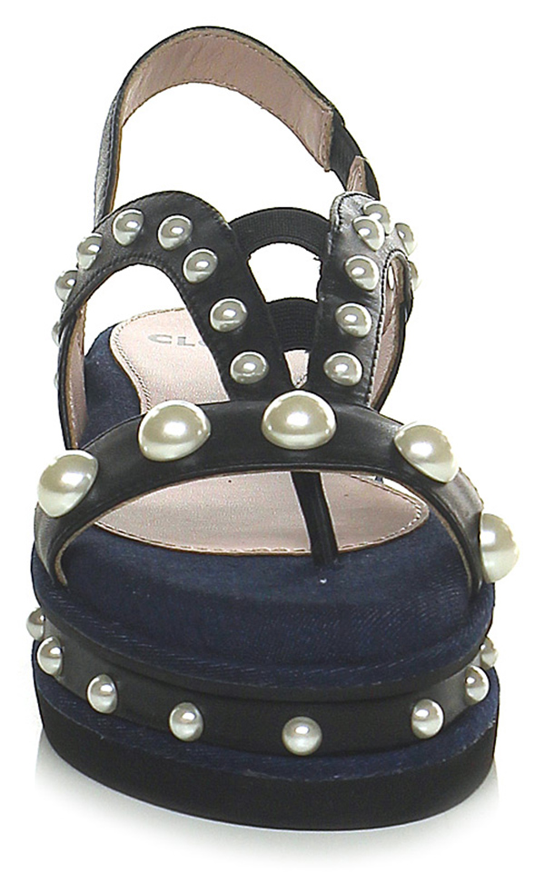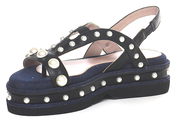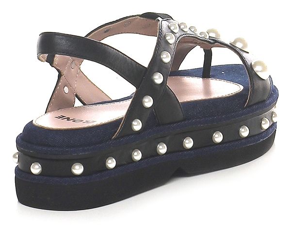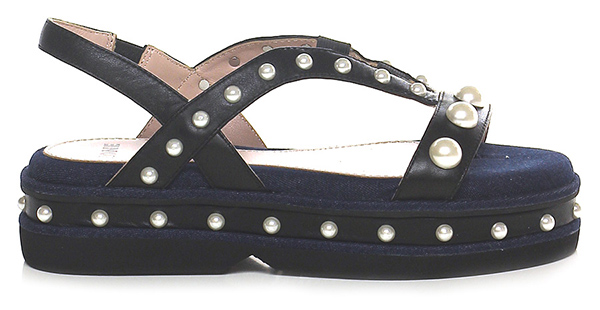 Sandalo basso in pelle e tessuto con cinturino su retro e perle su tomaia. Suola in gomma, tacco 55, platform 45 con battuta 10.