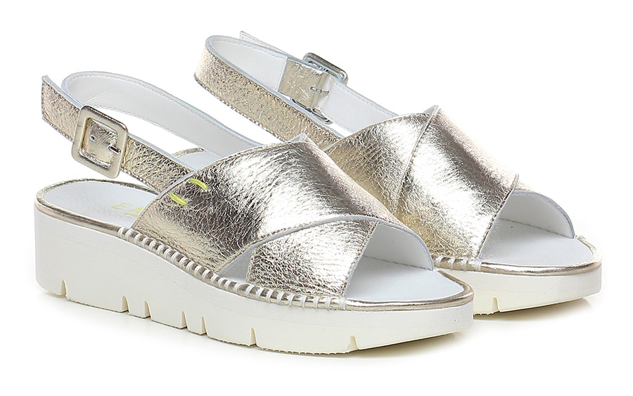 Sandalo basso in pelle laminata con cinturino sul retro, suola in gomma. Tacco 45, platform 30 con battuta 15.