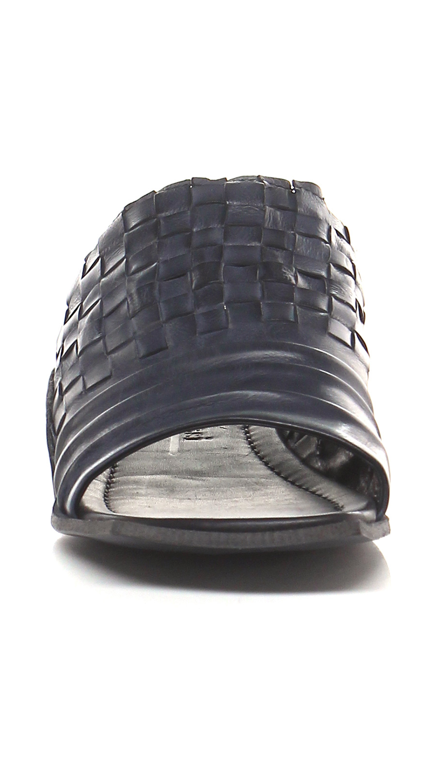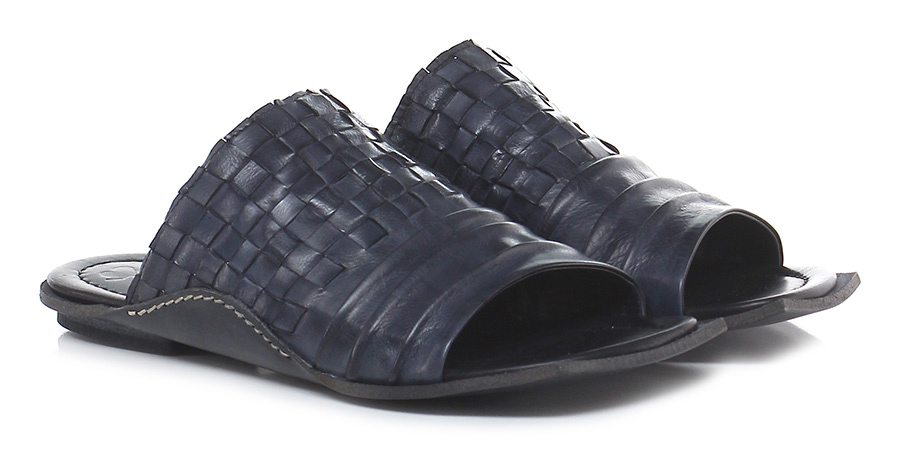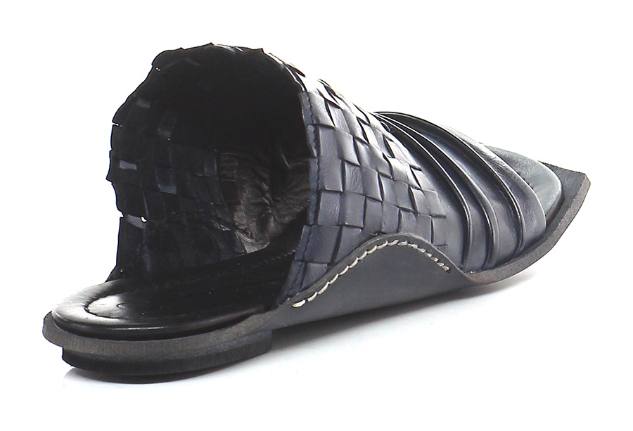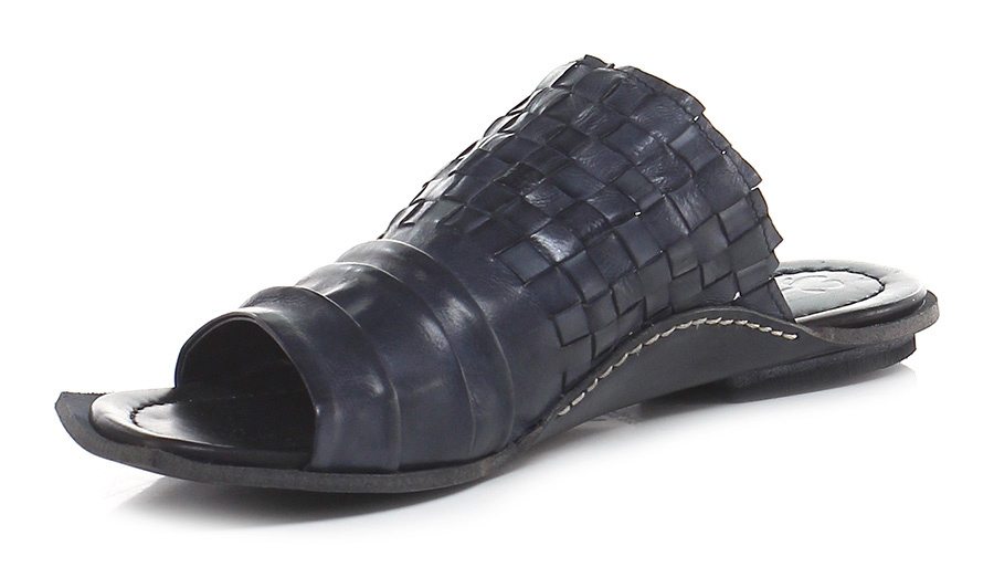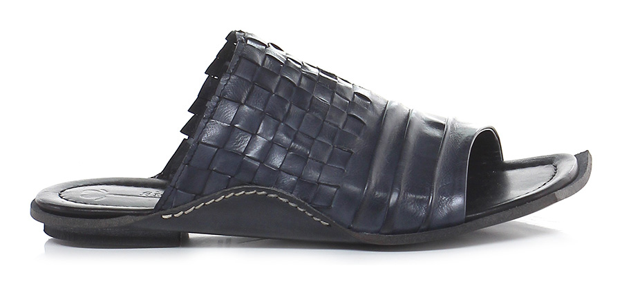Sandalo basso in pelle intrecciata e pelle effetto delavè vintage con suola in cuoio. Tacco 15, effetto piega frontale.