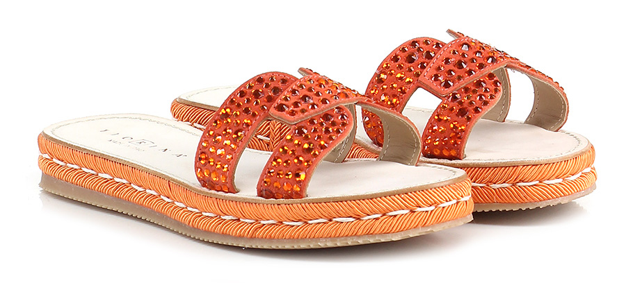 Sandalo basso in camoscio con applicazioni strass su tomaia e suola in gomma. Tacco 25.