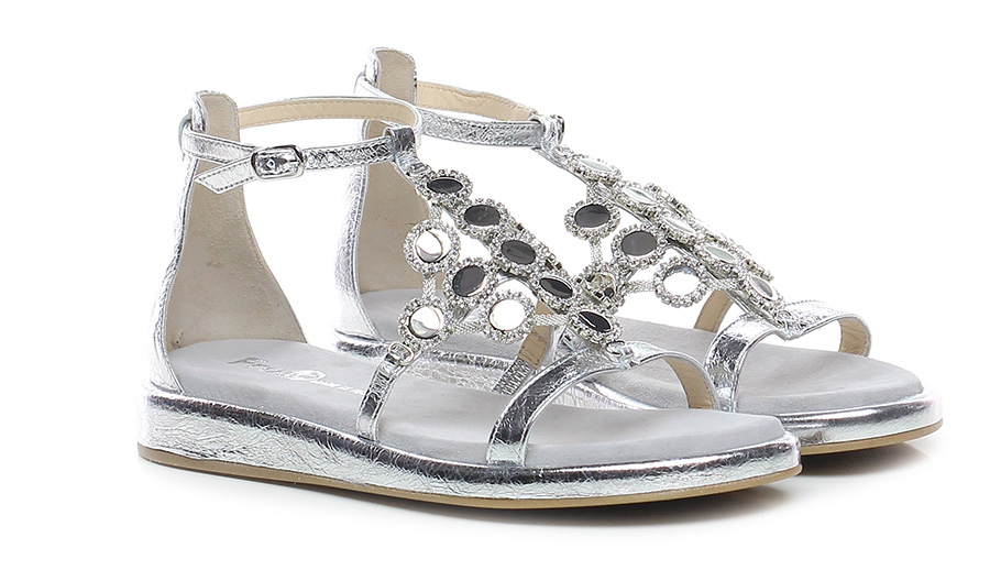 Sandalo basso in pelle laminata a listini con inserti elasticizzati, cinturino alla caviglia e applicazioni di pietre effetto metallici su tomaia, suola in gomma. Tacco 30, platform 20 con battuta 10, rivestito in pelle