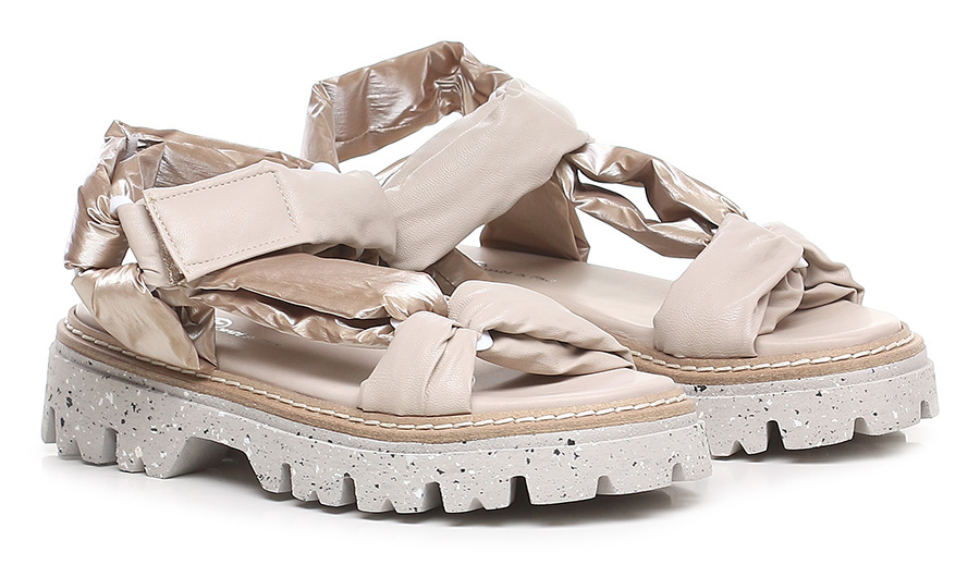 Sandalo in tessuto e pelle con cinturino alla caviglia con chiusura a strapp. Suola in gomma extralight. Altezza tacco 40mm, platform 30mm con battuta 10mm.