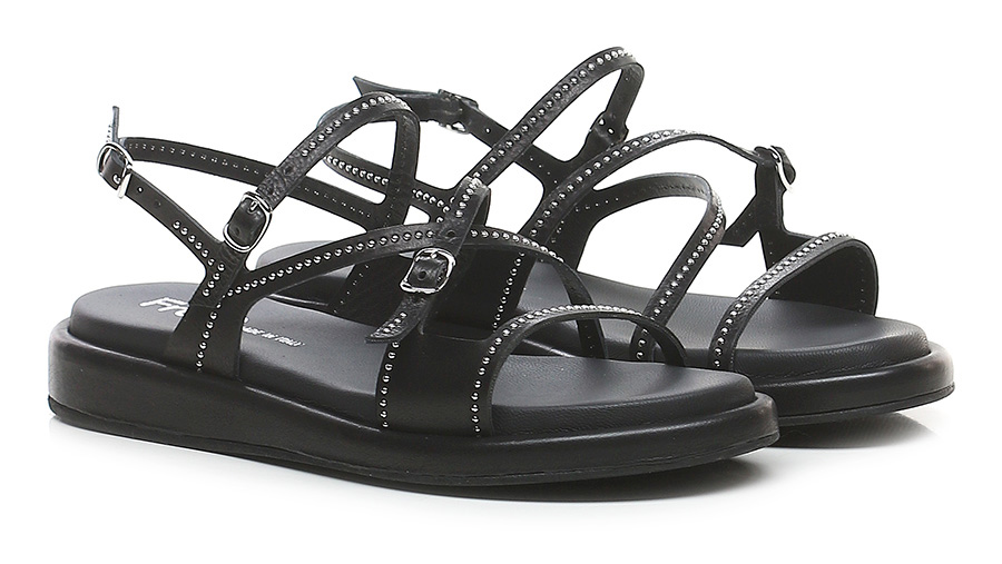 Sandalo in pelle con cinturino retro, alla caviglia e frontale. Borchie su tomaia. Suola in gomma. Altezza tacco 25mm, platform 15mm con battuta 10mm.