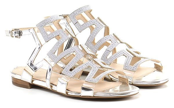 Sandalo basso in eco pelle laminata e tessuto con cinturino su retro e strass su tomaia. Suola in gomma, tacco 20.