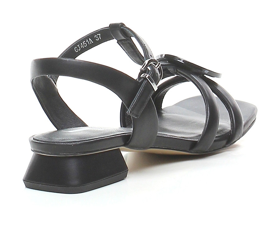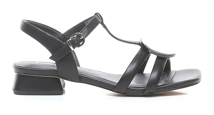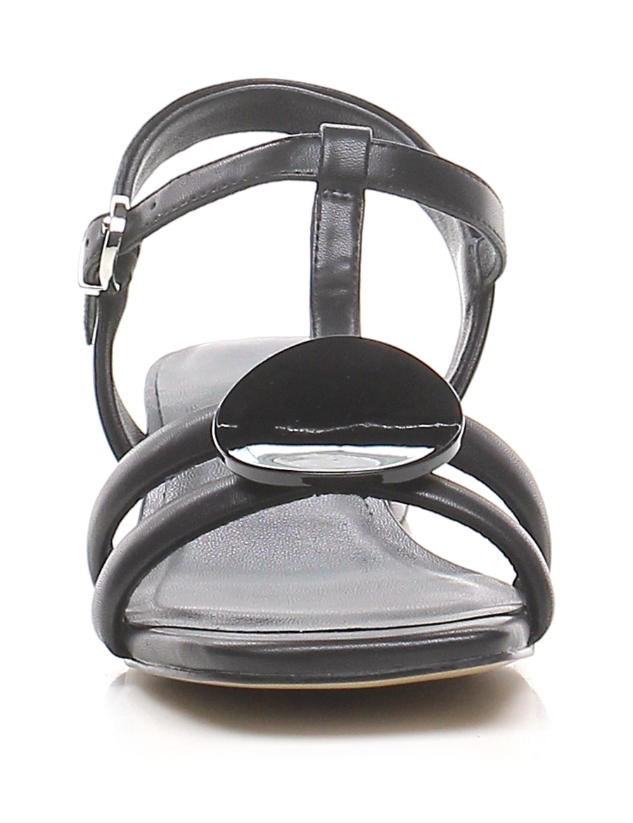 Sandalo basso in pelle a listini imbottiti con cinturino alla caviglia e accessorio su tomaia in pvc. Suola in gomma. Tacco 35, rivestito in pelle.