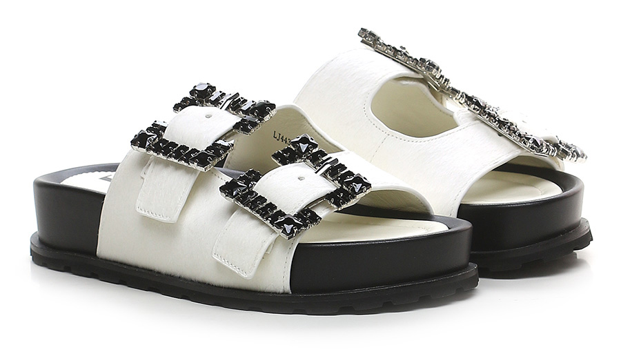 Sandalo in cavallino con pietre su fibbia. Suola in gomma. Altezza tacco 45mm, platform 30mm con battuta 15mm.