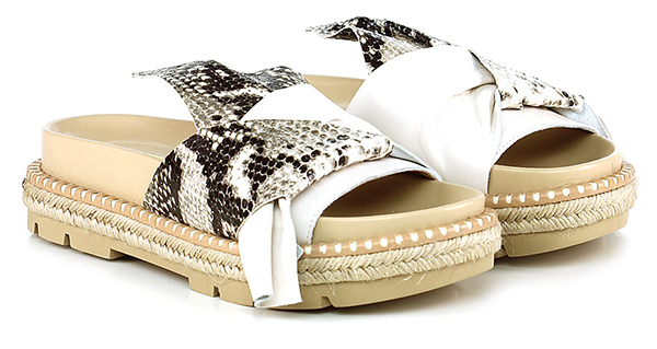 Sandalo basso in pelle e pelle stampa pitone con suola in gomma. Tacco 45, plantare fussbett.