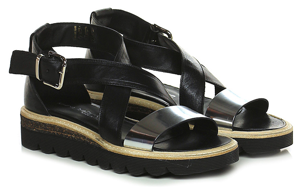 Sandalo basso in pelle e pelle laminata specchiata con incrocio frontale e suola in gomma. Tacco 40, platform 25 con battuta 15.