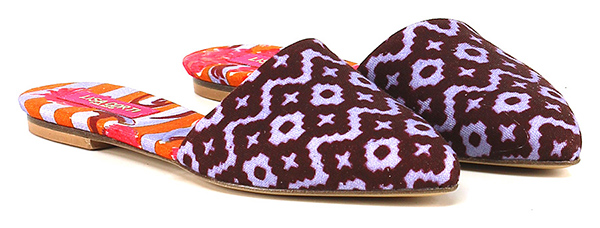 Sandalo basso in tessuto stampato e suola in cuoio. Tacco 15.