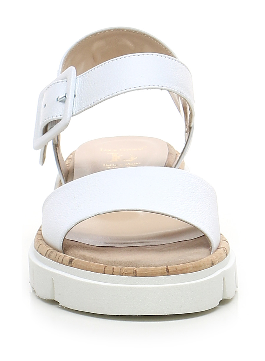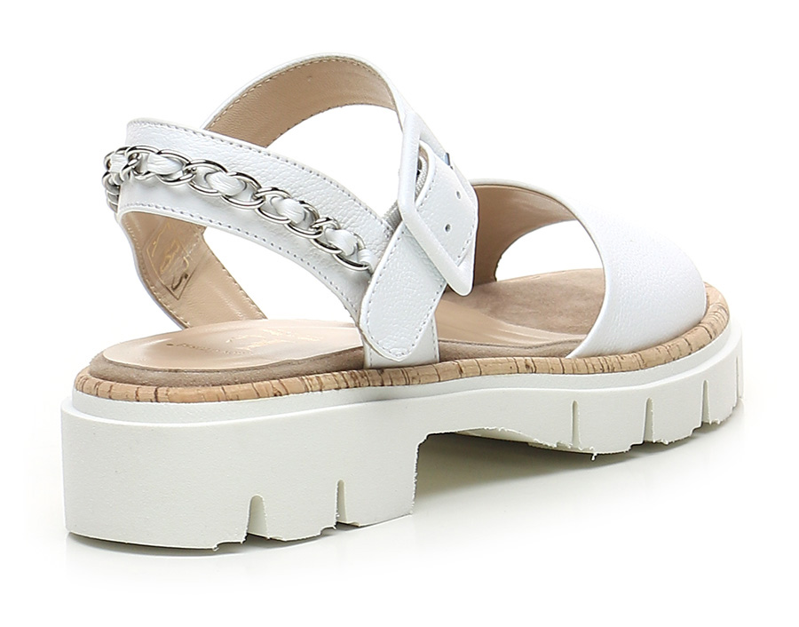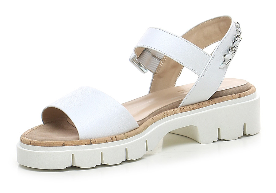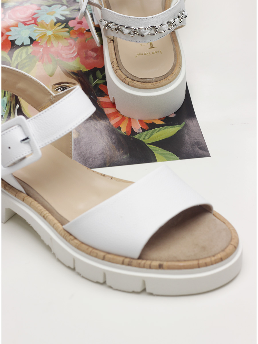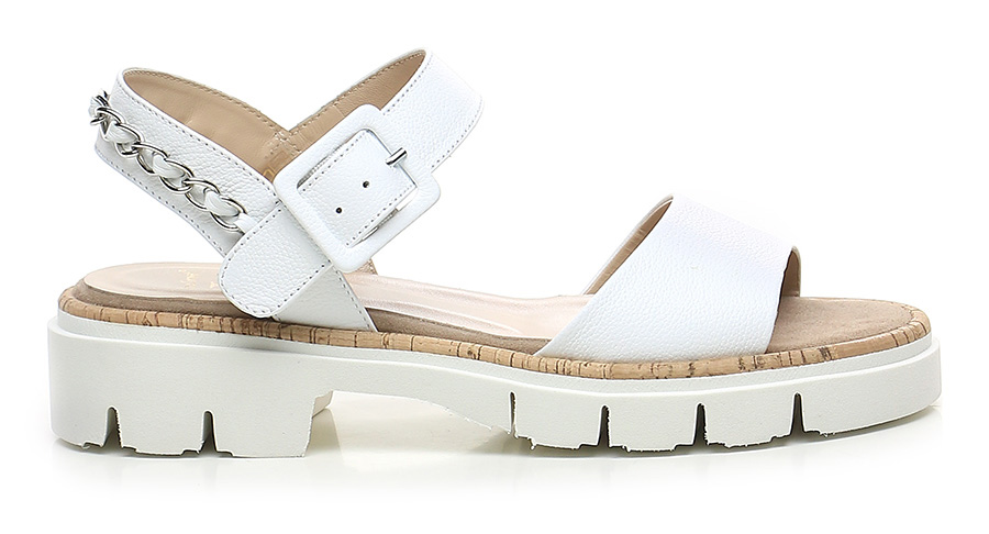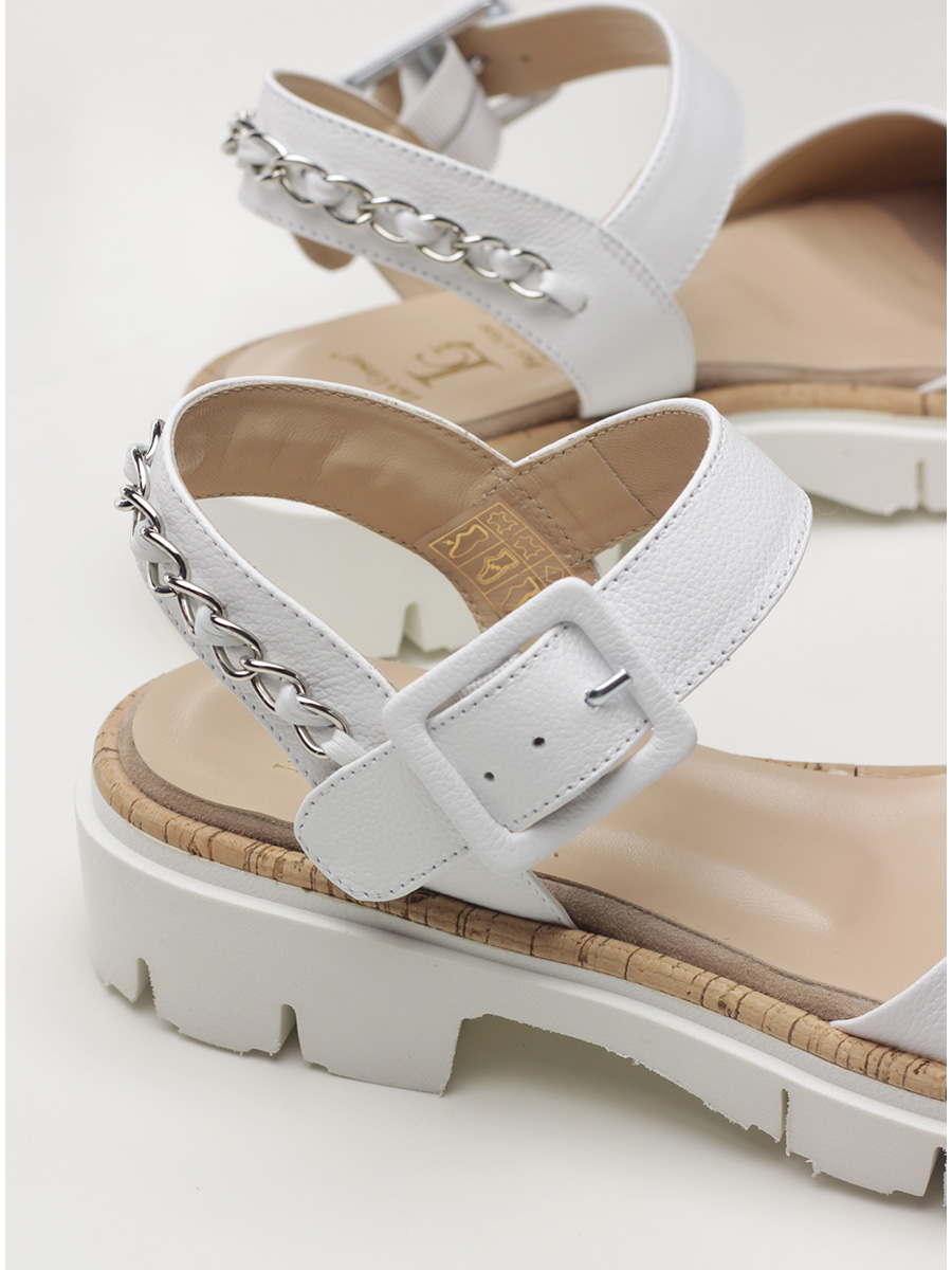 Sandalo in pelle con cinturino alla caviglia e accessorio a catena sul retro. Suola in gomma. Altezza tacco 40mm, platform 25mm con battuta 15mm.