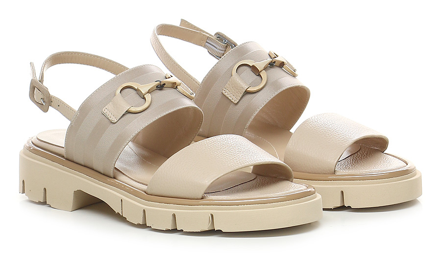 Sandalo in pelle e tessuto con cinturino retro. Suola in gomma. Altezza tacco 40mm, platform 20mm con battuta 20mm.