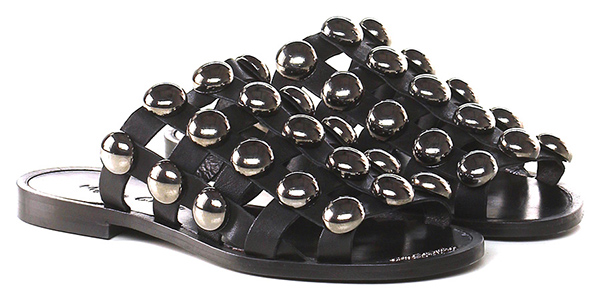 Sandalo basso in pelle con borchie su tomaia e suola in cuoio. Tacco 15.