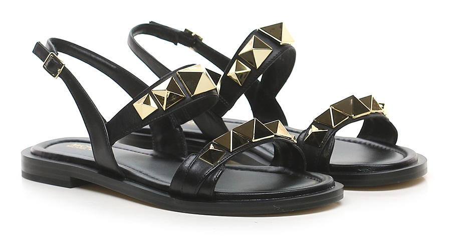 Sandalo in pelle con cinturino sul retro e borchie gold su tomaia. Suola in gomma. Altezza tacco 20mm.