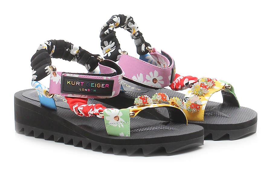 Sandalo basso in tessuto con cinturino a strappo, suola carrarmato in gomma extra light. Tacco 40, platform 15 con battuta 25. Applicazioni frontali e plantare sagomato.
