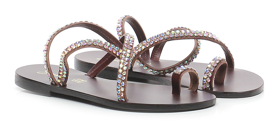 Sandalo a infradito in pelle con cinturino alla caviglia e strass su tomaia, suola in gomma. Tacco 10.