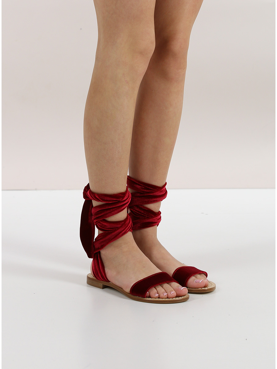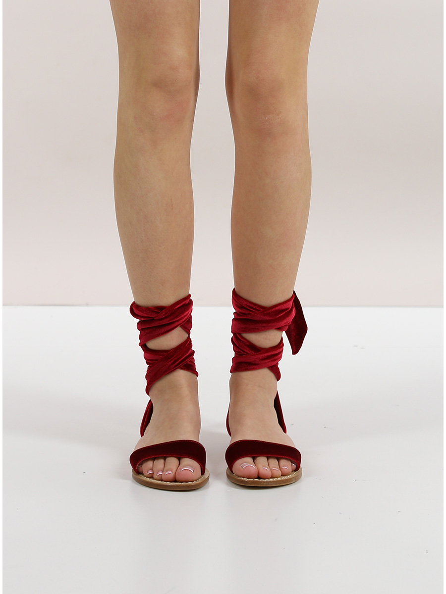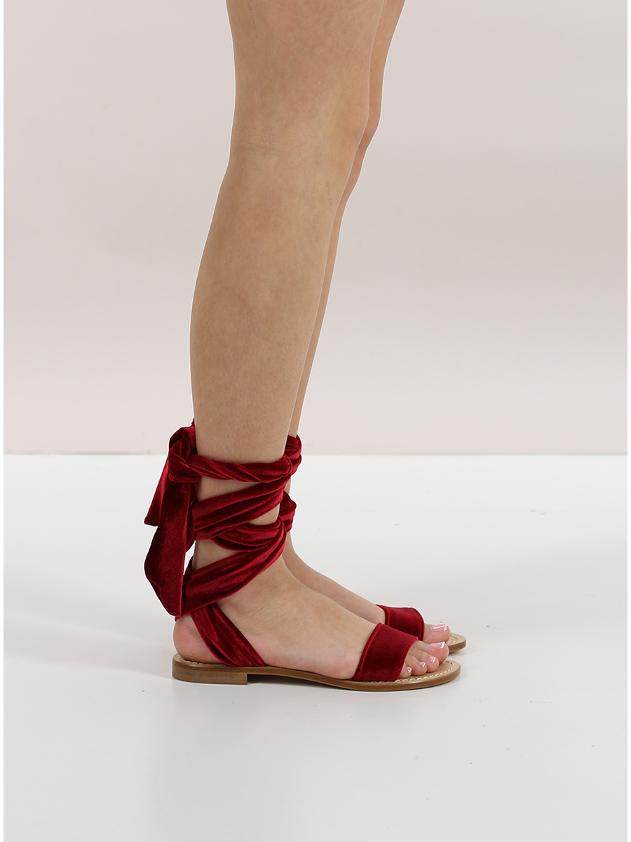Sandalo in velluto con allacciatura alla caviglia. Suola in cuoio. Altezza tacco 15mm.
