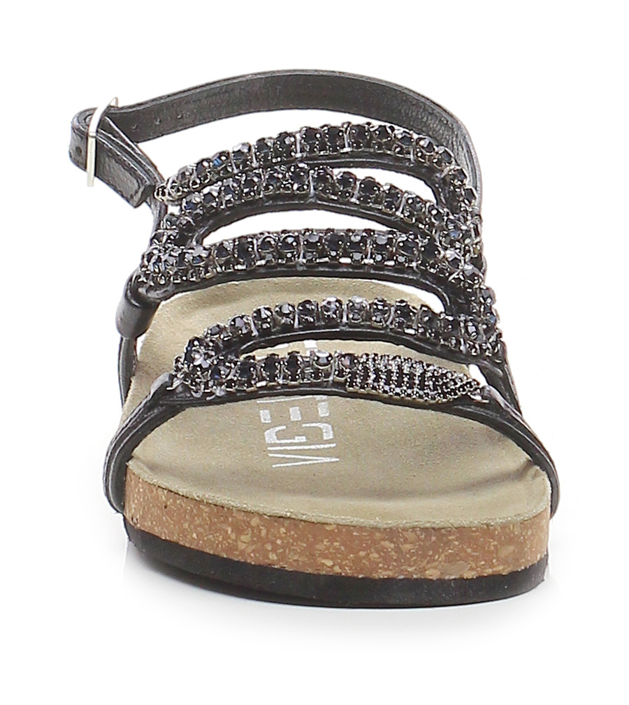Sandalo basso in pelle con cinturino sul retro e applicazione frontale a forma di serpente con cristalli, suola in gomma. Tacco 25, platform 15 con battuta 10. Plantare fussbett e fondo in suguero.