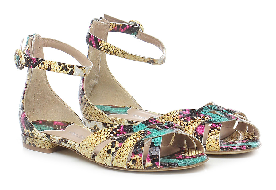 Sandalo basso in pelle in stampa pitone con cinturino alla caviglia e zip sul retro, suola in cuoio. Tacco 20.