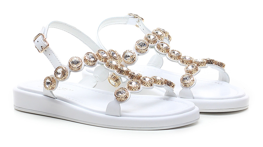 Sandalo basso in pelle a listini con cinturino sul retro con maxi pietre in strass su tomaia, suola in gomma. Tacco 30, platform 15 con battuta 15.