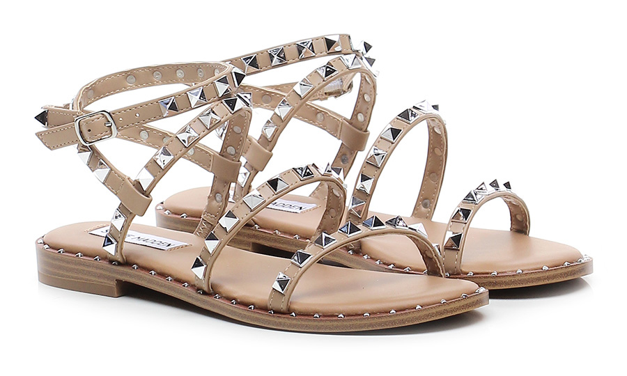 Sandalo basso in eco pelle con cinturino alla caviglia tempestato di borchie, suola in gomma. Tacco 20, micro borchie su profilo suola e plantare morbido imbottito.