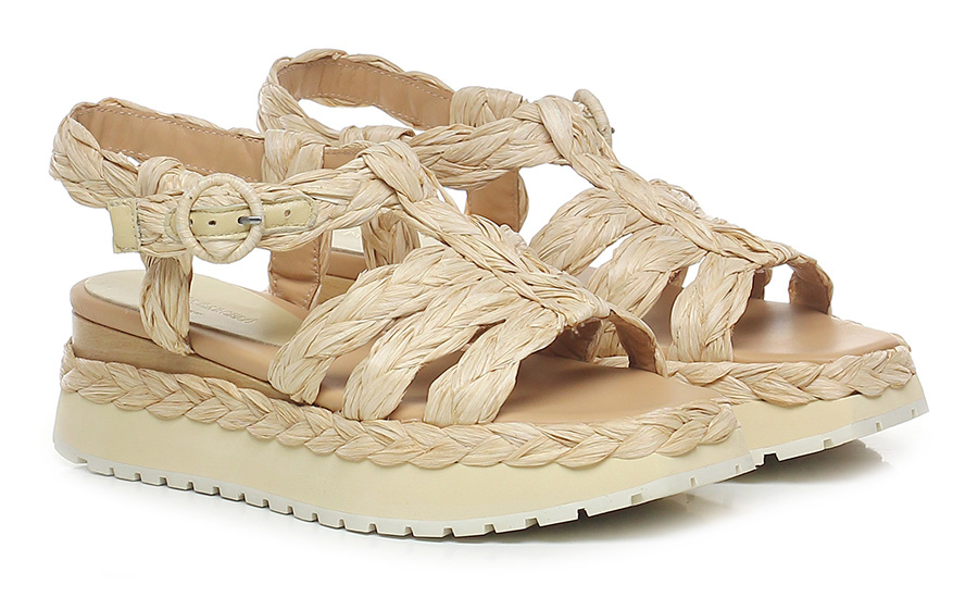 Sandalo basso in raffia, cinturino sul retro con fibbia. Suola doppio plateau in effetto legno, gomma light e raffia. Tacco 55, platform 35 con battuta 20.