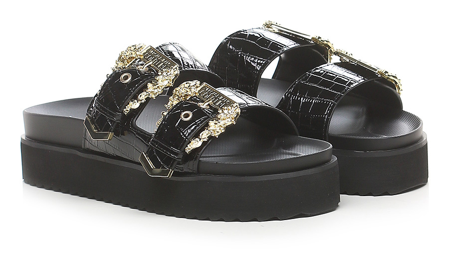 Sandalo in similpelle stampa cocco con doppia fibbia frontale. Fibbia metallica gold loggata. Suola in gomma. Altezza tacco 45mm, platform 40mm con battuta 5mm.