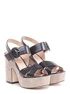 Sandalo alto in pelle e camoscio con cinturino su dietro, suola in gomma. Tacco 115, platform 45 con battuta 70, plateau foderato in camoscio.
