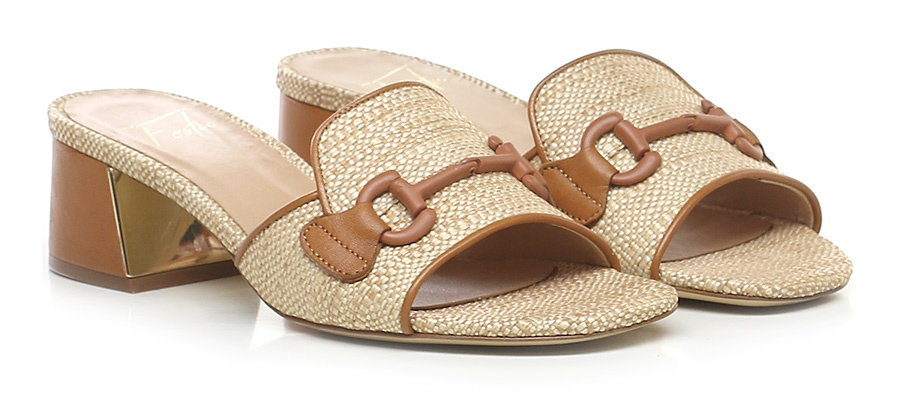 Sandalo in raffia e pelle con accessorio metallico frontale. Suola in cuoio. Altezza tacco 50mm.