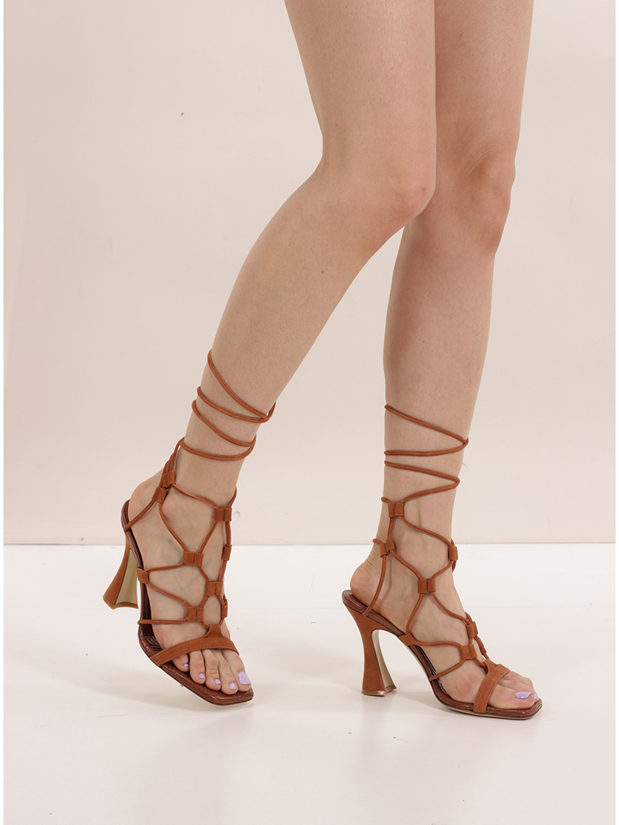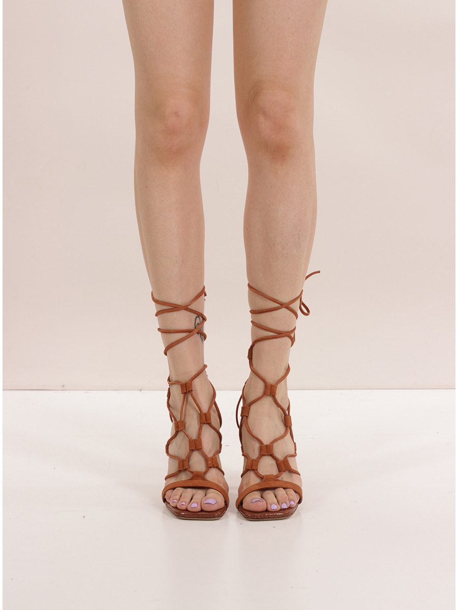 Sandalo in camoscio con allacciatura alla caviglia. Suola in cuoio. Altezza tacco 100mm.