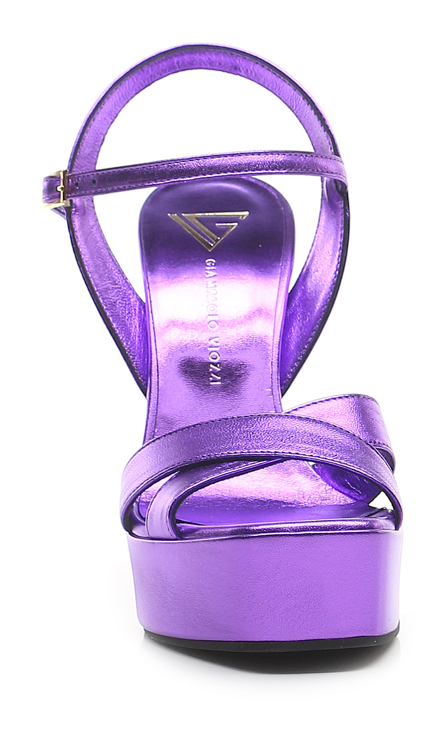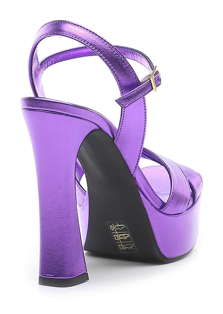 Sandalo in pelle laminata con cinturino alla caviglia e suola in gomma. Altezza tacco 140mm, platform 40mm con battuta 100mm.