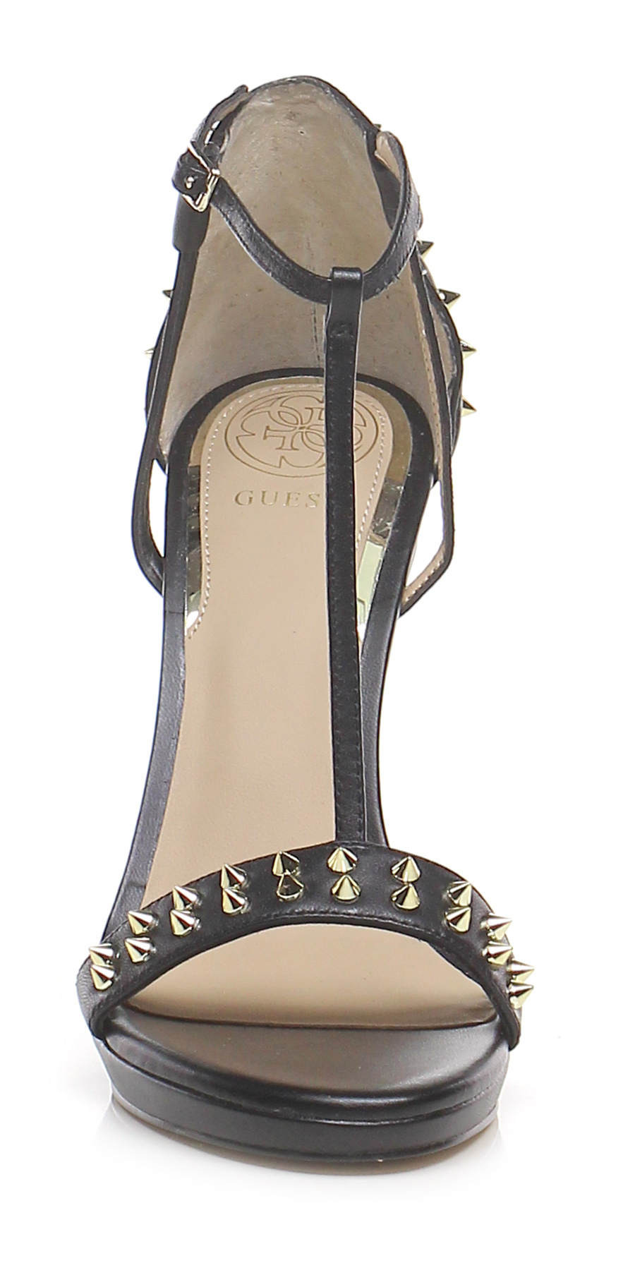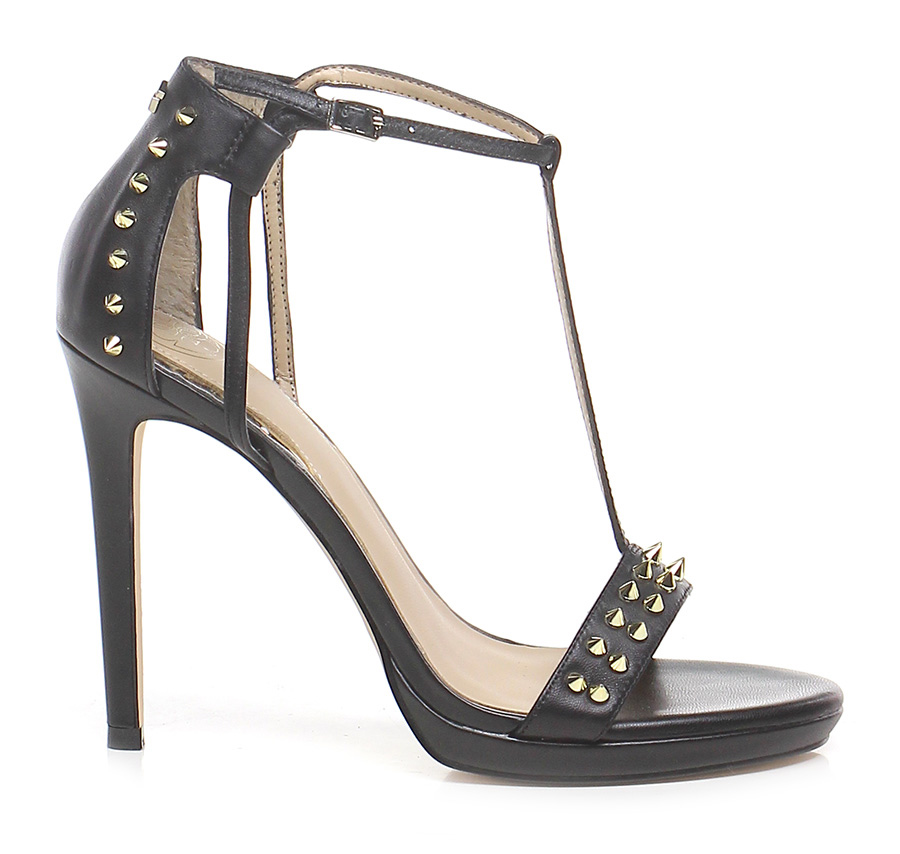Sandalo alto in pelle con cinturino alla caviglie, borchie su retro e fronte e suola in gomma. Tacco 115, platform 20 con battuta 95.