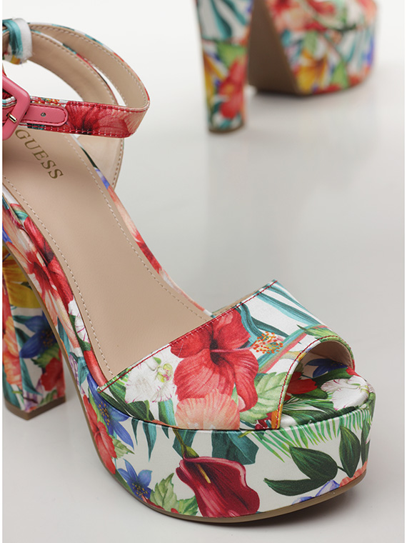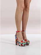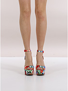 Sandalo in tessuto con cinturino alla caviglia e suola in gomma. Altezza tacco 150mm, platform 50mm con battuta 100mm. Tacco foderato in tessuto.