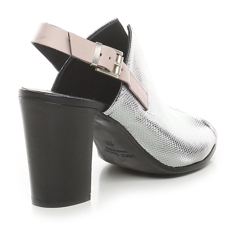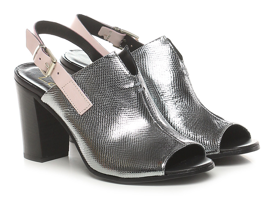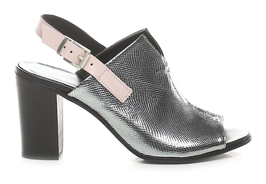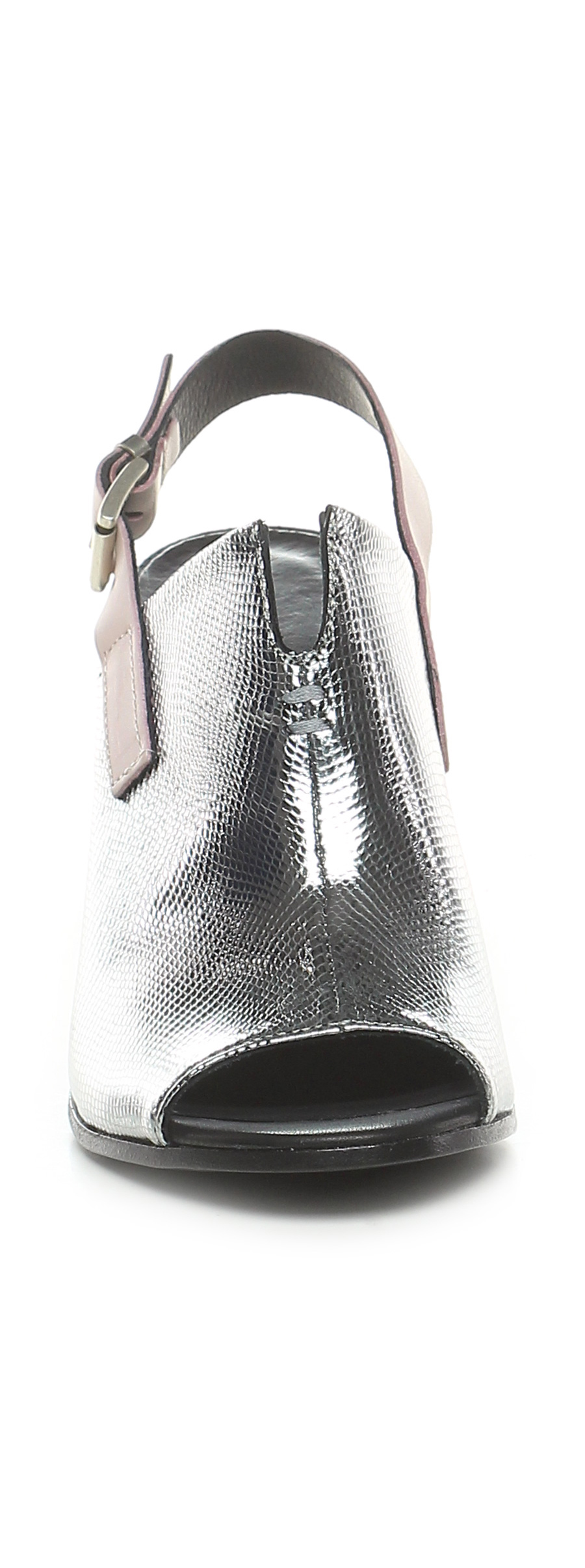 Sandalo alto in pelle laminata stampa pitone con cinturino su retro e suola in cuoio e gomma. Tacco 90.