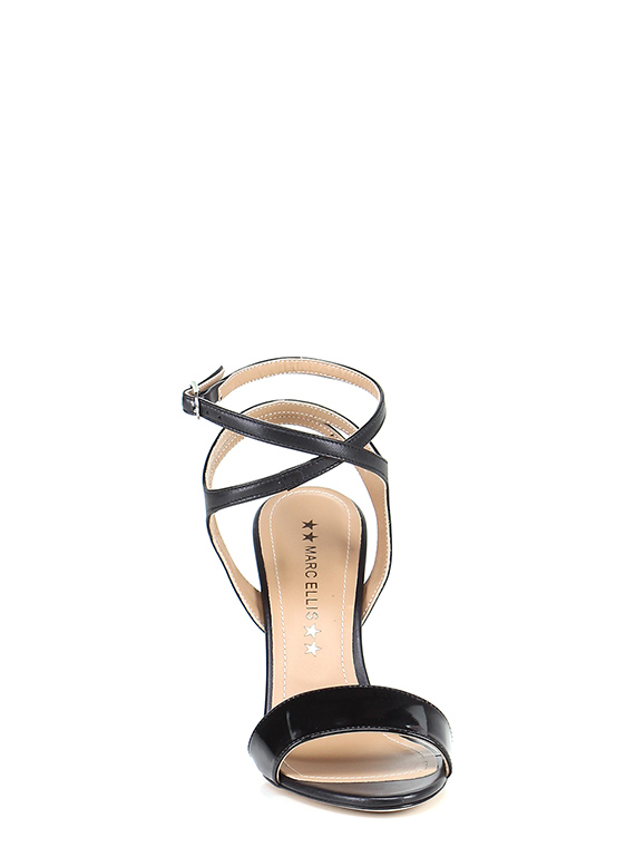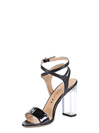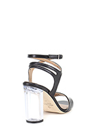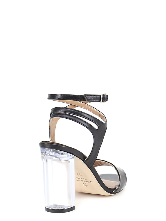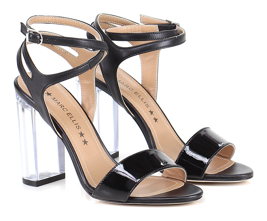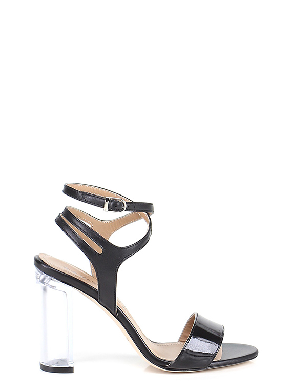 Sandalo alto in pelle e vernice con cinturino ad incrocio alla caviglia e suola in cuoio. Tacco 100 in pvc trasparente.